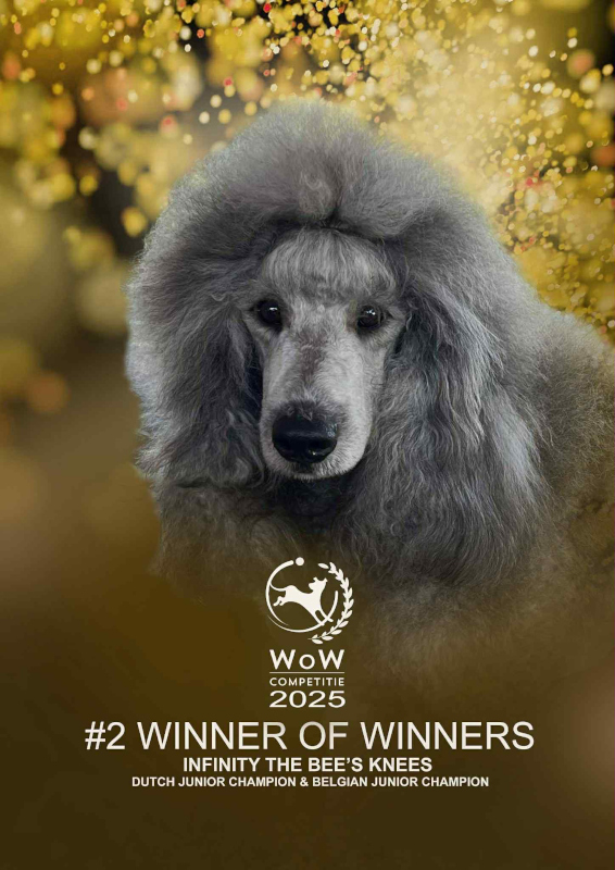 Infinity The Bee's Knees, een grijze poedel, met de tekst '#2 Winner Of Winners' Grijze dwergpoedel Hippie