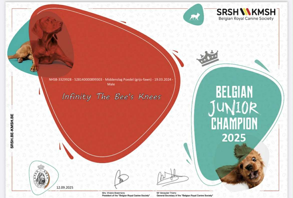 Zilver poedel op hondenshow Twee gewonnen rozetten van het Brabants Rashondenfestival 2025 met blauw-oranje linten en pootafdrukken, één met de tekst \'THANKS K.V. WAALWIJK EO\' en één met \'BOB\' (Best of Breed), beide met het logo van K.V. Waalwijk. Rechts ligt een blauwe toegangspas voor de erekeuring met catalogusnummer 369 en vermelding van het ras: Caniche Moyen (Middenslag Poedel) Keurverslag van het Brabants Rashondenfestival CAC op 12 juli 2025 voor de Middenslag Poedel \'Infinity The Bee’s Knees\', reu, ingeschreven in de tussenklasse. De hond behaalde de kwalificatie \'Uitmuntend', plaatsing 1, CAC en BOB. De keurmeester was Rune Tyvold (NO). In het Engelse keurrapport wordt onder andere het uitstekende formaat, masculiene hoofd, correcte oorzet, toplijn, lichaam, gangwerk en temperament geprezen