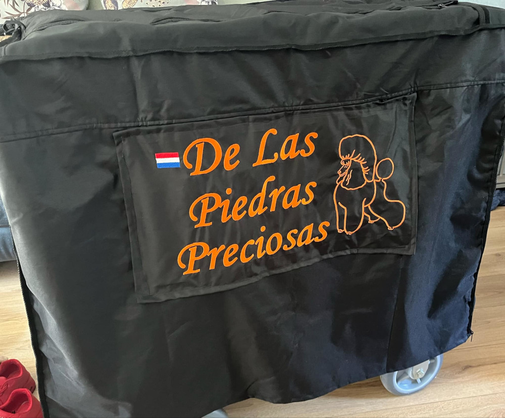 Zwarte benchhoes met in oranje letters de naam van de kennel met een poedel erbij Zwarte benchhoes met in oranje letters de naam van de kennel met een poedel erbij Zwarte benchhoes met in oranje letters de naam van de kennel met een poedel erbij