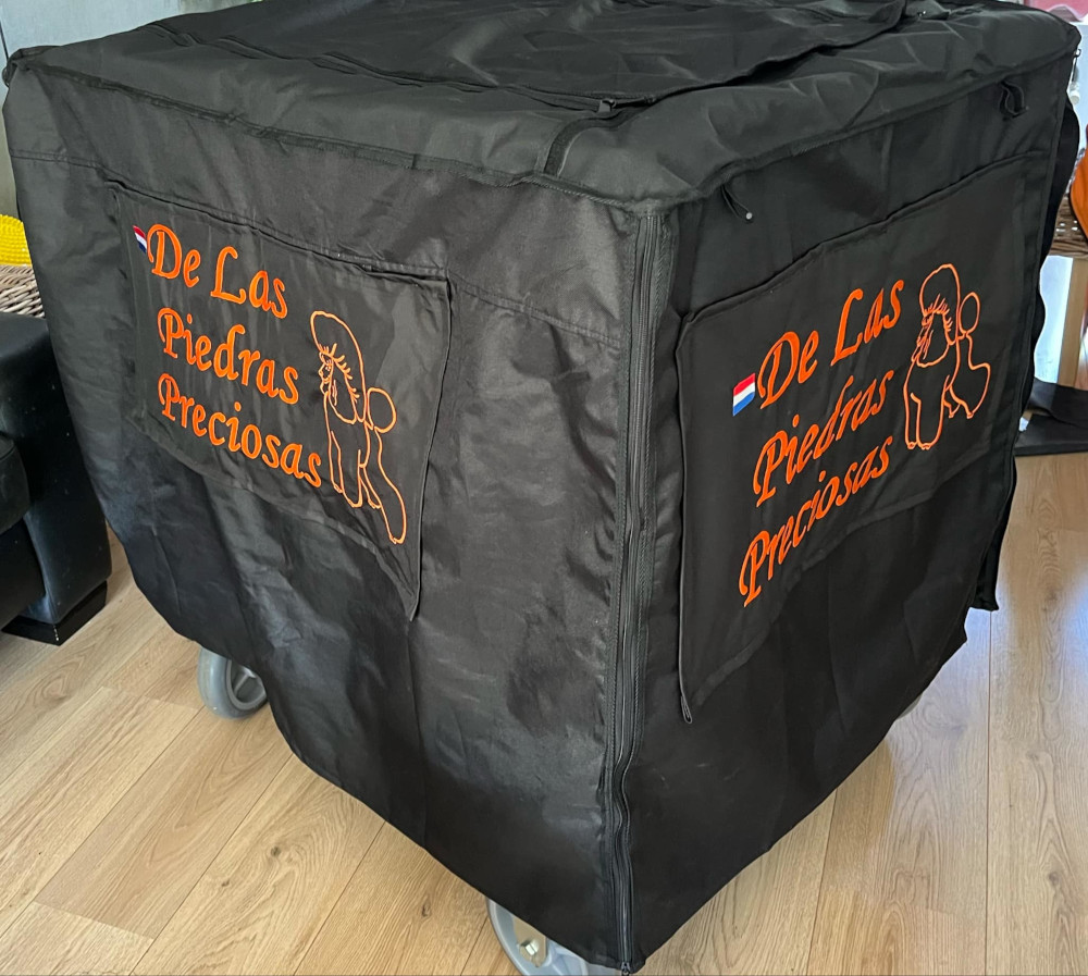 Zwarte benchhoes met in oranje letters de naam van de kennel met een poedel erbij Zwarte benchhoes met in oranje letters de naam van de kennel met een poedel erbij Zwarte benchhoes met in oranje letters de naam van de kennel met een poedel erbij
